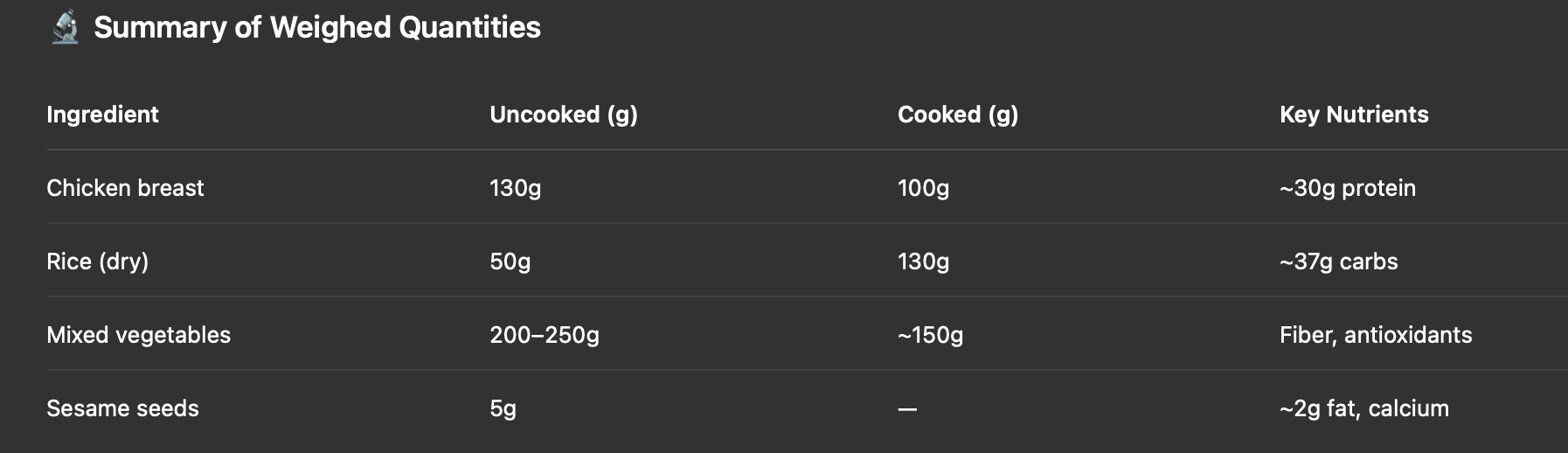 As I have the best girlfriend in the world, she happily cooks for me at home and has been willing to help me with my journey. Whenever we do this, I ask GPT for the recommended amounts (veggies/carbs/protein etc) for the options that we have at home.