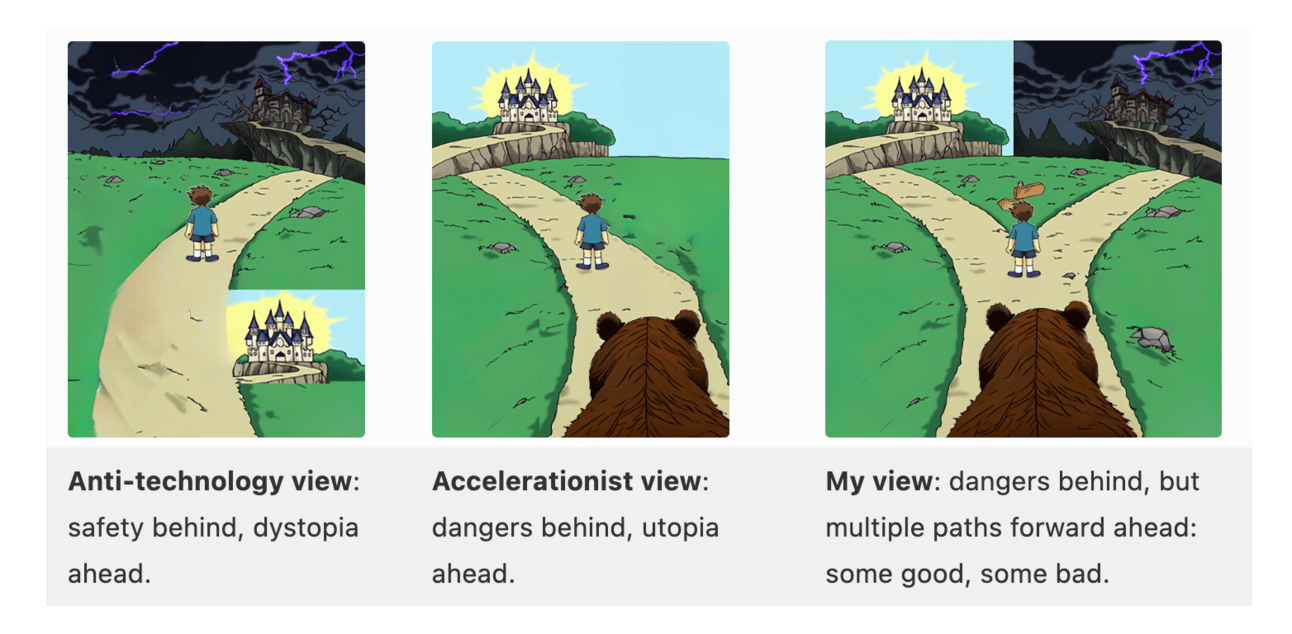 Accelerationists: they believe we should innovate as quickly as possible to solve big problems and create a better future. They see technology, like AI and space exploration, as tools to improve life for everyone.