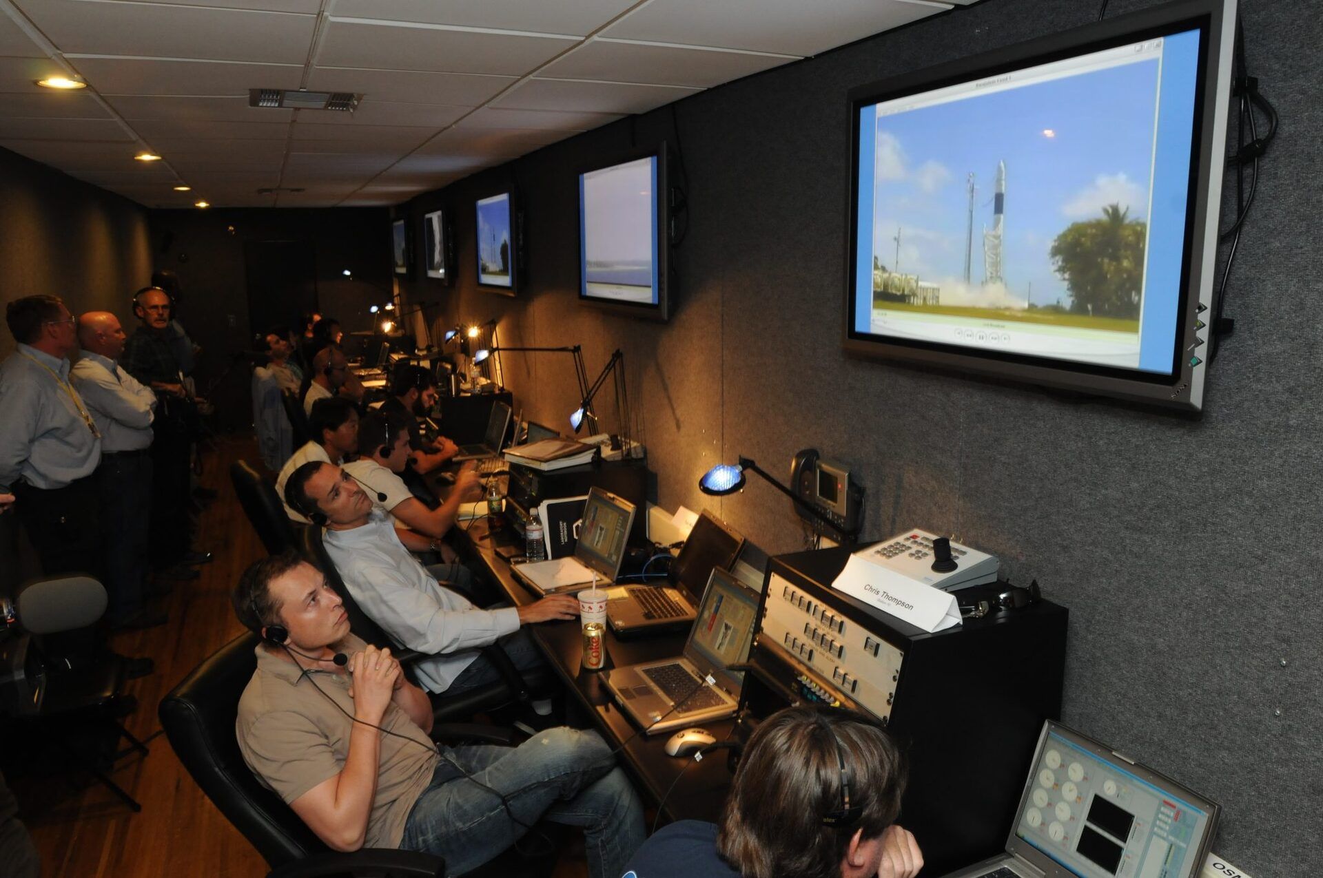 Musk, seated, watches the launch of the fourth flight of the Falcon 1 rocket in California. A “do or die” mission as another failed attempt could have bankrupted SpaceX. Read the full story here (click).